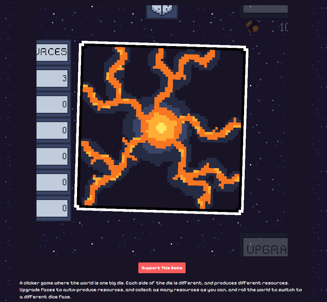 A clicker game where the world is one big die. Each side of the die is different, and produces different resources. Upgrade faces to auto-produce resources, and collect as many resources as you can, and roll the world to switch to a different dice face.